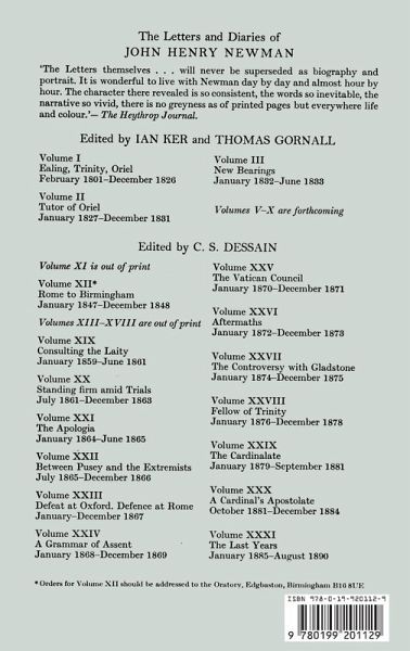A scholarly edition of the letters and diaries of John Henry Newman. The edition presents an authoritative text, together with an introduction, commentary notes, and scholarly apparatus.