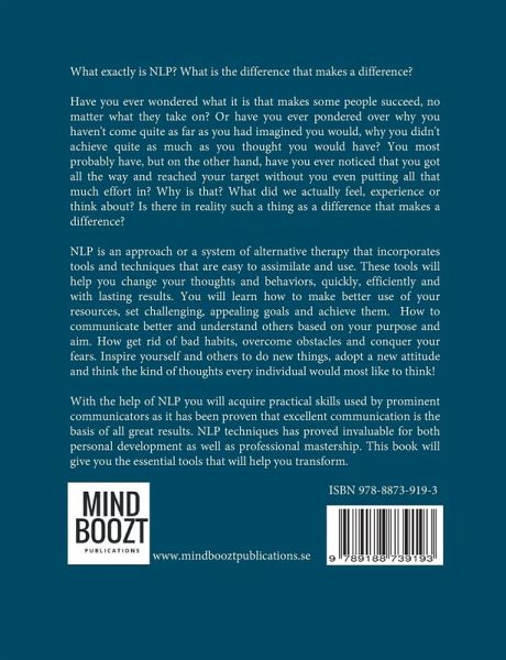 What exactly is NLP? What is the difference that makes a difference? Have you ever wondered what it is that makes some people succeed, no matter what they take on? Or have you ever pondered over why you haven't come quite as far as you had imagined you would, why you didn't achieve quite as much as you thought you would have? You most probably have, but on the other hand, have you ever noticed that you got all the way and reached your target without you even putting all that much effort in? Why is that? What did we actually feel, experience or think about? Is there in reality such a thing as a difference that makes a difference? NLP is an approach or a system of alternative therapy that incorporates tools and techniques that are easy to assimilate and use. These tools will help you change your thoughts and behaviors, quickly, efficiently and with lasting results. You will learn how to make better use of your resources, set challenging, appealing goals and achieve them. How to communicate better and understand others based on your purpose and aim. How get rid of bad habits, overcome obstacles and conquer your fears. Inspire yourself and others to do new things, adopt a new attitude and think the kind of thoughts every individual would most like to think! With the help of NLP you will acquire practical skills used by prominent communicators as it has been proven that excellent communication is the basis of all great results. NLP techniques has proved invaluable for both personal development as well as professional mastership. This e-book will give you the essential tools that will help you transform whatever you want in your life, which in turn will lead you achieving whatever you desire. When you sharpen your ability to communicate with NLP, you also end up increasing your efficiency and improving your leadership and results. When you learn exactly how communication works and make the decision that you want to develop your communication skills, you will start to notice a difference straight away. Your will also get better at understanding and influencing others. And yes, you can actually learn how to steer and control your consciousness and create entirely new results.