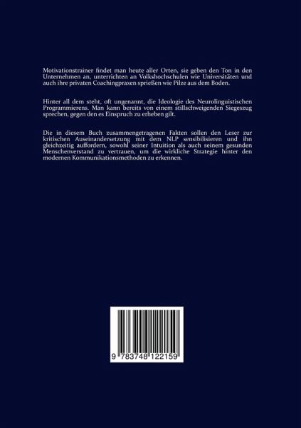 In dem vorliegenden Buch wird der Versuch unternommen, einem Phänomen auf die Spur zu kommen, welches im öffentlichen Diskurs bislang gerade einmal als Randthema in Erscheinung tritt, dem Neurolinguistischen Programmieren.Der Autor geht in seinem Buch zum einen der Frage nach, was hinter den drei Buchstaben dieses NLP eigentlich steckt, aber auch, wie dessen stillschweigender Siegeszug, vorbei an den zahlreichen gesellschaftlichen Debatten, zustande kommen konnte.Anhand einiger entscheidender Punkte wird sowohl das manipulative Wesen des NLP offengelegt, als auch seine ideologische Struktur diskutiert und damit der Versuch unternommen, den Bürger für die kritische Auseinandersetzung mit dem NLP zu sensibilisieren und ihn gleichzeitig aufzufordern, in diesem Zusammenhang sowohl seiner Intuition als auch seinem gesunden Menschenverstand zu vertrauen, um die wirkliche Strategie hinter den modernen Kommunikationsmethoden zu erkennen.