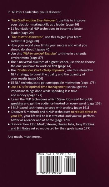 Do you want to become a better leader by improving your decision making? Do you wonder how you can improve your people management and communication skills? Do you want to discover the NLP techniques used by the greatest leaders in the world, so you can be a great leader yourself? Then keep reading... Being a great manager or leader isn't a born skill. Many great leaders developed and improved their leadership style during their life and career. A lot of the leadership thought-models, actions and behaviors are analyzed and summarized in easy-to-use NLP techniques. NLP stands for Neuro-Linguistic-Programming and this is used to model successful people, managers and leaders. And if you model successful people correctly, you'll get the same results as they have, for example: a higher productivity and income. In 'NLP for Leadership' you'll discover: - 'The-Confirmation-Bias-Remover': use this to improve your decision-making skills as a leader (page 96) - 11 foundational NLP-techniques to become a better leader (page 29) - 'The-Instant-Motivator', this is like rocket-fuel for your team page 80) - How your world view, limits your success and what you should do about it (page 40) - Use this 'NLP-In-control-Exercise' to thrive in a chaotic environment (page 87) - The 5 universal qualities of a great leader. Choose the one you have to work on first (page 44) - The 'Continuous-Productivity-Improver', use this interactive NLP strategy, to boost the quality and the quantity of your output and results (page 106) - NLP techniques to negotiate like a leader, so you get the best possible deal (page 142) - 15 NLP techniques to create unstoppable motivation for yourself (page 175) - Use the 4 D's for optimal time management, so you get the important things done while spending less time and money (page 127) - Learn the NLP-techniques, used by Steve Jobs for public speaking, The audience will be hooked on every word you say (page 153) - 3 NLP based techniques to cope with anxiety (page 161) - Discover 5 methods and 4 NLP techniques to reduce stress in your life. Your life will be calmer. You will perform better, both as a leader and at home (page 170) - Discover the secret that Elon Musk, Steven Jobs, Tony Robbins and Bill Gates use or used to get extremely motivated for their goals (page 177) And much, much more... Even if you don't have a master's in psychology, Business or Information Science, the NLP techniques explained and used by the great leaders, excel in their simplicity and can be used by any high-school drop-out. You might wonder if being a leader is something you're born with. Leadership is a skill. It's something you learn by practicing. By applying the NLP techniques of great leaders, like Elon Musk, Steve Jobs, Bill Gates and Tony Robbins you are fueled by kerosene and become a better leader in just a matter of weeks. So, if you're ready to take your career and salary-trajectory to the next level, scroll-up and click: 'add-to-cart'.
