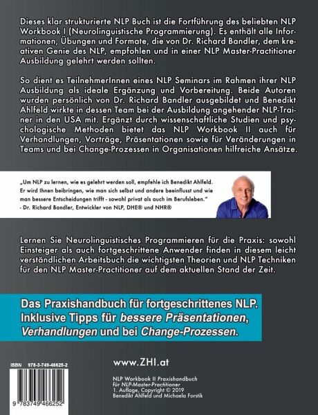 Dieses klar strukturierte NLP Buch ist die Fortführung des beliebten NLP Workbook I (Neurolinguistische Programmierung). Es enthält alle Informationen, Übungen und Formate, die von Dr. Richard Bandler, dem kreativen Genie des NLP, empfohlen und in einer NLP Master-Practitioner Ausbildung gelehrt werden sollten. So dient es TeilnehmerInnen eines NLP Seminars im Rahmen ihrer NLP Ausbildung als ideale Ergänzung und Vorbereitung. Beide Autoren wurden persönlich von Dr. Richard Bandler ausgebildet und Benedikt Ahlfeld wirkte in dessen Team bei der Ausbildung angehender NLP-Trainer in den USA mit. Ergänzt durch wissenschaftliche Studien und psychologische Methoden bietet das NLP Workbook II auch für Verhandlungen, Vorträge, Präsentationen sowie für Veränderungen in Teams und bei Change-Prozessen in Organisationen hilfreiche Ansätze. Lernen Sie Neurolinguistisches Programmieren für die Praxis: sowohl Einsteiger als auch fortgeschrittene Anwender finden in diesem leicht verständlichen Arbeitsbuch die wichtigsten Theorien und NLP Techniken für den NLP Master-Practitioner auf dem aktuellen Stand der Zeit. Dr. Richard Bandler (Entwickler von NLP und DHE®) sagt: "Um NLP zu lernen, wie es gelehrt werden soll, empfehle ich Benedikt Ahlfeld."