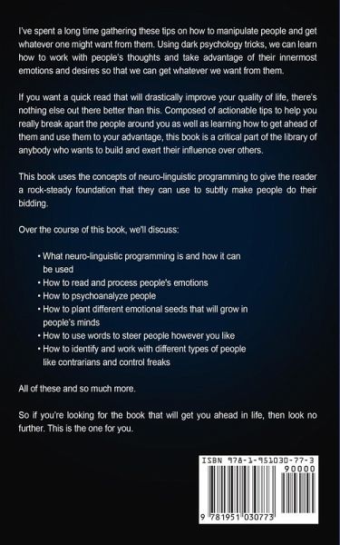 Dark Psychology Series Book #4 I've spent a long time gathering these tips on how to manipulate people and get whatever one might want from them. Using dark psychology tricks, we can learn how to work with people's thoughts and take advantage of their innermost emotions and desires so that we can get whatever we want from them. If you want a quick read that will drastically improve your quality of life, there's nothing else out there better than this. Composed of actionable tips to help you really break apart the people around you as well as learning how to get ahead of them and use them to your advantage, this book is a critical part of the library of anybody who wants to build and exert their influence over others. This book uses the concepts of neuro-linguistic programming to give the reader a rock-steady foundation that they can use to subtly make people do their bidding. Over the course of this book, we'll discuss: What neuro-linguistic programming is and how it can be used How to read and process people's emotions How to psychoanalyze people How to plant different emotional seeds that will grow in people's minds How to use words to steer people however you like How to identify and work with different types of people like contrarians and control freaks All of these and so much more. So if you're looking for the book that will get you ahead in life, then look no further. This is the one for you.