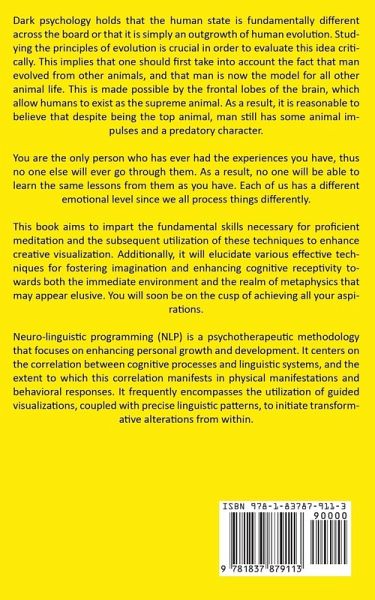 Dark psychology holds that the human state is fundamentally different across the board or that it is simply an outgrowth of human evolution. Studying the principles of evolution is crucial in order to evaluate this idea critically. This implies that one should first take into account the fact that man evolved from other animals, and that man is now the model for all other animal life. This is made possible by the frontal lobes of the brain, which allow humans to exist as the supreme animal. As a result, it is reasonable to believe that despite being the top animal, man still has some animal impulses and a predatory character. You are the only person who has ever had the experiences you have, thus no one else will ever go through them. As a result, no one will be able to learn the same lessons from them as you have. Each of us has a different emotional level since we all process things differently. This book aims to impart the fundamental skills necessary for proficient meditation and the subsequent utilization of these techniques to enhance creative visualization. Additionally, it will elucidate various effective techniques for fostering imagination and enhancing cognitive receptivity towards both the immediate environment and the realm of metaphysics that may appear elusive. You will soon be on the cusp of achieving all your aspirations. Neuro-linguistic programming (NLP) is a psychotherapeutic methodology that focuses on enhancing personal growth and development. It centers on the correlation between cognitive processes and linguistic systems, and the extent to which this correlation manifests in physical manifestations and behavioral responses. It frequently encompasses the utilization of guided visualizations, coupled with precise linguistic patterns, to initiate transformative alterations from within.