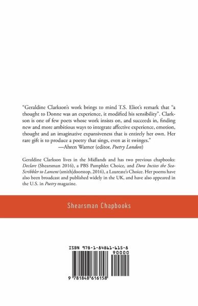 "Geraldine Clarkson's work brings to mind T.S. Eliot's remark that "a thought to Donne was an experience, it modified his sensibility". Clarkson is one of few poets whose work insists on, and succeeds in, finding new and more ambitious ways to integrate sensation, emotion, thought and an imaginative expansiveness that is entirely her own. Her rare gift is to produce a poetry that sings, even as it swinges." -Ahren Warner (editor, Poetry London)