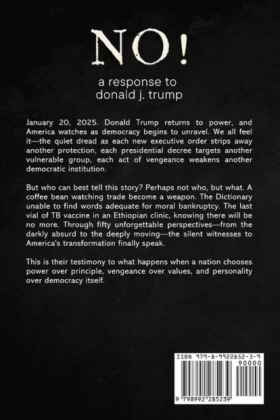 January 20, 2025. Donald Trump returns to power, and America watches as democracy begins to unravel. We all feel it-the quiet dread as each new executive order strips away another protection, each presidential decree targets another vulnerable group, each act of vengeance weakens another democratic institution. But who can best tell this story? Perhaps not who, but what. A coffee bean watching trade become a weapon. The Dictionary unable to find words adequate for moral bankruptcy. The last vial of TB vaccine in an Ethiopian clinic, knowing there will be no more. Through fifty unforgettable perspectives-from the darkly absurd to the deeply moving-the silent witnesses to America's transformation finally speak. This is their testimony to what happens when a nation chooses power over principle, vengeance over values, and personality over democracy itself.