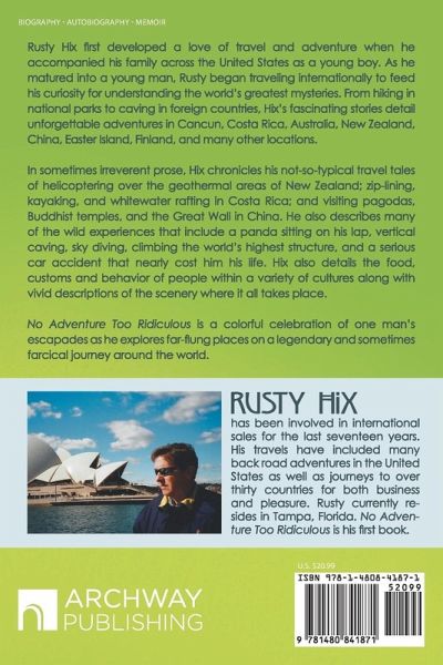 Rusty Hix first developed a love of travel and adventure when he accompanied his family across the United States as a young boy. As he matured into a young man, Rusty began traveling internationally to feed his curiosity for understanding the world’s greatest mysteries. From hiking in national parks to caving in foreign countries, Hix’s fascinating stories detail unforgettable adventures in Cancun, Costa Rica, Australia, New Zealand, China, Easter Island, Finland, and many other locations. In sometimes irreverent prose, Hix chronicles his not-so-typical travel tales of helicoptering over the geothermal areas of New Zealand; zip-lining, kayaking, and whitewater rafting in Costa Rica; and visiting pagodas, Buddhist temples, and the Great Wall in China. He also describes many of the wild experiences that include a panda sitting on his lap, vertical caving, sky diving, climbing the world’s highest structure, and a serious car accident that nearly cost him his life. Hix also details the food, customs and behavior of people within a variety of cultures along with vivid descriptions of the scenery where it all takes place. No Adventure Too Ridiculous is a colorful celebration of one man’s escapades as he explores far-flung places on a legendary and sometimes farcical journey around the world.