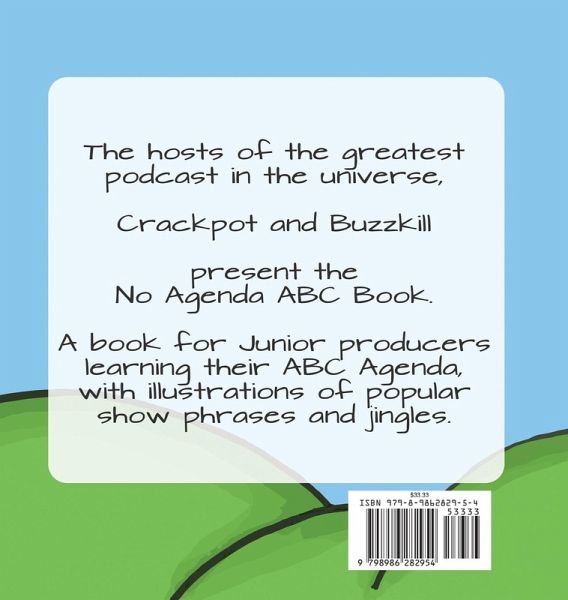 The hosts of the best podcast in the universe, Crackpot and Buzzkill, present the No Agenda ABC Book. A book for junior producers learning their ABC Agenda, with illustrations of popular show phrases and jingles