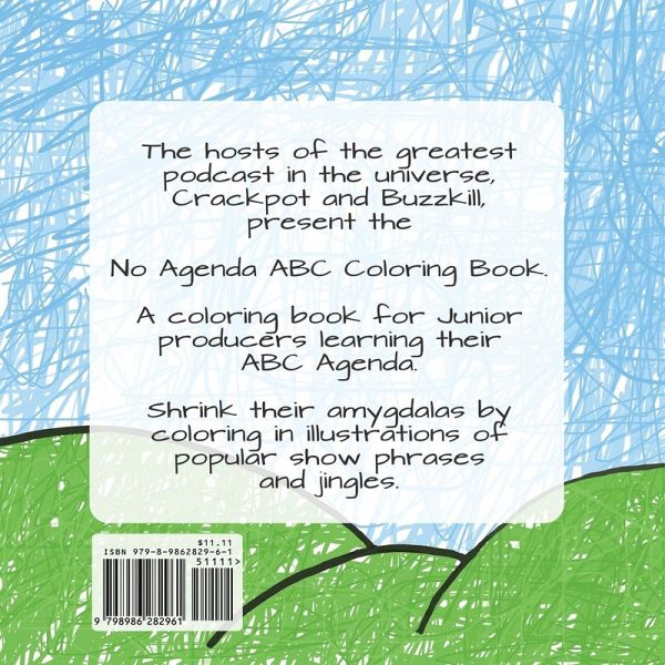 The hosts of the best podcast in the universe, Crackpot and Buzzkill, present the No Agenda ABC Coloring Book. A coloring book for junior producers learning their ABC Agenda. Shrink their amygdala's by coloring in illustrations of popular show phrases and jingles.