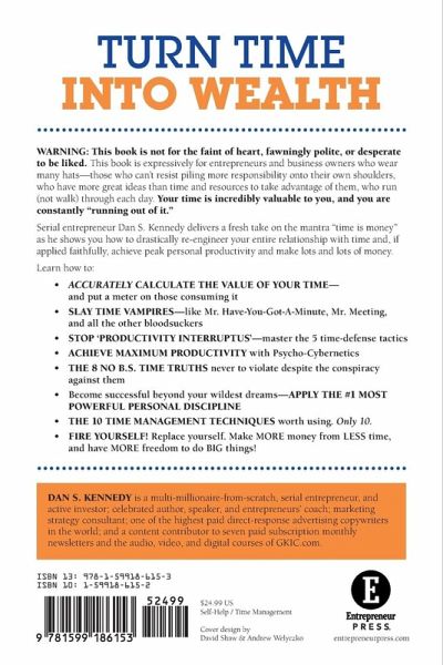 TURN TIME INTO WEALTH WARNING: This book is not for the fain of heart, fawningly polite, or desperate to be liked. This book is expressively for entrepreneurs and business owners who wear many hats-those who can't resist piling more responsibility onto his own shoulders, who has more great ideas that time and resources to take advantage of them, who runs (not walks) through each day. Your time is incredibly valuable to you, and you are constantly "running out of it." Serial entrepreneur Dan S. Kennedy delivers a fresh take on the mantra "time is money" as he shows you how to drastically re-engineer your entire relationship with time and, if applied faithfully, achieve peak personal productivity and make lots and lots of money. Learn how to: * ACCURATELY CALCULATE THE VALUE OF YOUR TIME-and put a meter on those consuming it * SLAY TIME VAMPIRES-like Mr. Have-You-Got-A-Minute, Mr. Meeting, and all the other bloodsuckers * STOP 'PRODUCTIVUS INTERRUPTUS'-master the 5 time-defense tactics * ACHIEVE MAXIMUM PRODUCTIVITY with Psycho-Cybernetics * THE 8 NO B.S. TIME TRUTHS never to violate despite the conspiracy against them * Become successful beyond your wildest dreams-APPLY THE #1 MOST POWERFUL PERSONAL DISCIPLINE * THE 10 TIME MANAGEMENT TECHNIQUES worth using. Only 10! * FIRE YOURSELF! Replace yourself. Make MORE money from LESS time, and have MORE freedom to do BIG things!