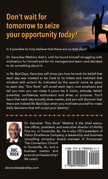 Don't wait for tomorrow to seize your opportunity today! Is it possible to truly believe that there are no bad days? Dr. Karockas Watkins didn't, until he found himself struggling with motivation for himself and for his management team-and decided to do something about it. In No Bad Days, Karockas will show you how he took his belief that each day was created to be lived to its fullest and matched that mindset with action! As indicated by the special name he gives to each day, "Doc Rock" will unveil each day's core emphasis and tell you how you can make it yours-be it vision, attitude, belief, potential, confidence, enthusiasm and drive, or purpose. You'll learn that each day actually does matter, and you will discover that there are indeed No Bad Days when you motivate yourself to make daily decisions that will sculpt your destiny!