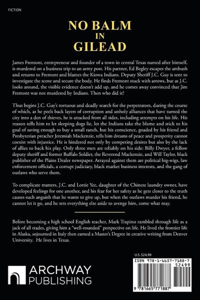 James Fremont, entrepreneur and founder of a town in central Texas named after himself, is murdered on a business trip to an army post. His partner, Ed Begley escapes the ambush and returns to Fremont and blames the Kiowa Indians. Deputy Sheriff J.C. Guy is sent to investigate the scene and secure the body. He finds Fremont stuck with arrows, but as J.C. looks around, the visible evidence doesn't add up, and he comes away convinced that Jim Fremont was not murdered by Indians. Then who did it? Thus begins J.C. Guy's tortuous and deadly search for the perpetrators, during the course of which, as he peels back layers of corruption and unholy alliances that have turned the city into a den of thieves, he is attacked from all sides, including attempts on his life. His reason tells him to let sleeping dogs lie, let the Indians take the blame and stick to his goal of saving enough to buy a small ranch, but his conscience, goaded by his friend and Presbyterian preacher Jeremiah Mackenzie, tells him dreams of peace and prosperity cannot coexist with injustice. He is hindered not only by competing desires but also by the lack of allies to back his play. Only three men are reliably on his side: Billy Dwyer, a fellow deputy sheriff and former Buffalo Soldier, the Reverend Mackenzie, and Will Taylor, black publisher of the Plains Dealer newspaper. Arrayed against them are political big-wigs, law enforcement officials, a corrupt judiciary, black market business interests, and the gang of outlaws who serve them. To complicate matters, J.C. and Lottie Yee, daughter of the Chinese laundry owner, have developed feelings for one another, and his fear for her safety as he gets closer to the truth causes such anguish that he wants to give up, but when the outlaws murder his friend, he cannot let it go, and he sets everything else aside to avenge him, come what may.