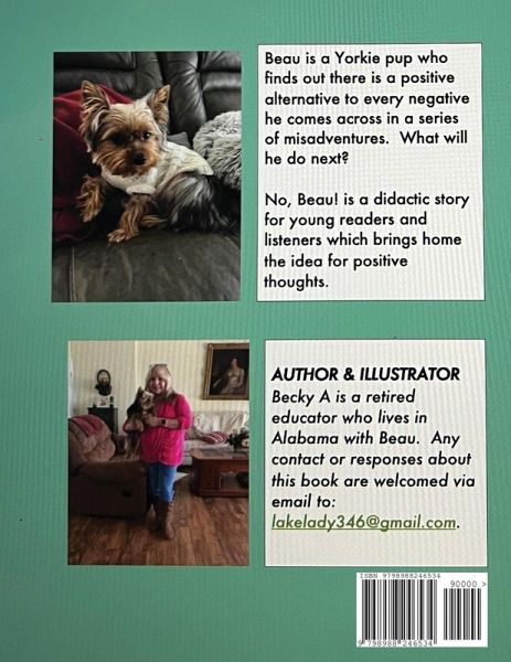 Beau is a Yorkie pup who finds out there is a positive alternative to every negative he comes across in a series of misadventures. He learns that attitudes and imagination are very important when he discovers things that he cannot do. What will he do next? No, Beau! is a didactic story for young readers and listeners which brings home the benefits of positive thoughts.