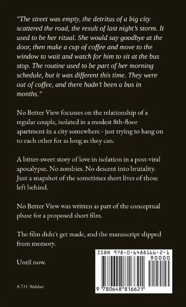 A bitter-sweet story of love in isolation in a post-viral apocalypse. No zombies. No descent into brutality. Just a snapshot of the sometimes short lives of those left behind.