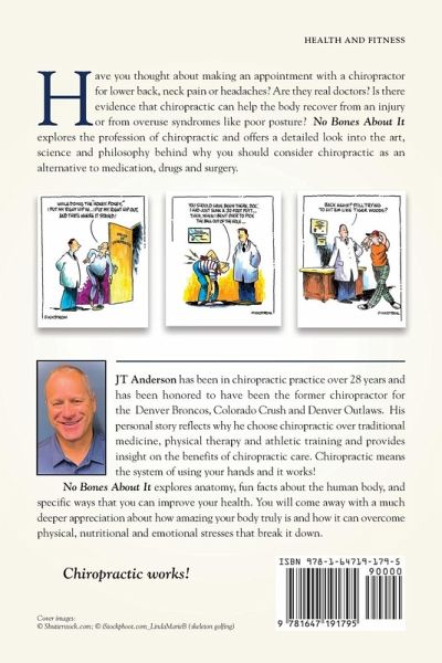 Have you ever wondered if chiropractors are real doctors? No Bones About It- a memoir of a chiropractor explores the art, philosophy, and science behind the natural approach toward health care. You will learn about why chiropractic helps not only with joint and muscle pain but also how it influences the nervous system to improve overall health. Doc JT has been the team chiropractor for the Denver Broncos, Colorado Crush indoor football team, and the Denver Outlaws professional lacrosse team. He has seen many bizarre and challenging injuries and has learned how to treat those who are suffering from a combination of chiropractic techniques including dry needling, cupping, myofascial release, and light force adjustments. Come explore the wonderful world of chiropractic and see why so many turn to this alternative form of medicine to help with headaches, back and neck pain, recovery from sports and auto injuries as well as improve their overall health.