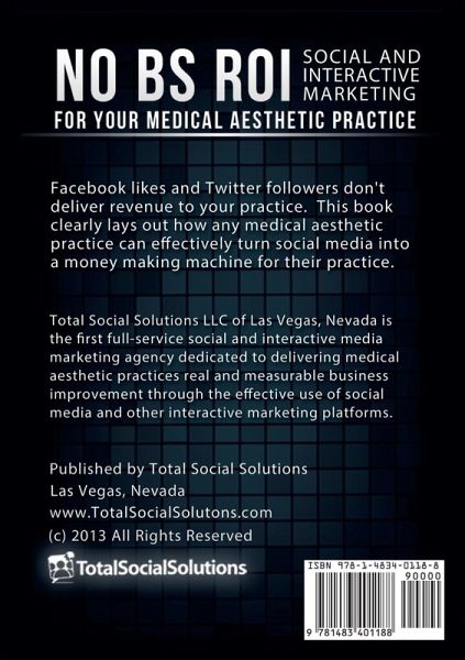 Facebook likes and Twitter followers don't deliver revenue to your practice. This book clearly lays out how any medical aesthetic practice can effectively turn social media into a money making machine for their practice. Total Social Solutions LLC of Las Vegas, Nevada is the first full-service social and interactive media marketing agency dedicated to delivering medical aesthetic practices real and measurable business improvement through the effective use of social media and other interactive marketing platforms. Published by Total Social Solutions Las Vegas, Nevada www.TotalSocialSolutons.com (c) 2013 All Rights Reserved