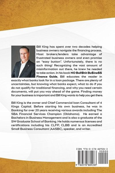 Bill King has spent over two decades helping business owners navigate the financing process. Most brokers/lenders take advantage of frustrated business owners and even promise an "easy button". Unfortunately, there is no such thing! Recognizing the vast amount of misinformation out there, he knew he needed to take action. In his book NO Bull$hit Business Finance Guide, Bill educates the reader in exactly what banks look for in a loan package. There are plenty of uncertainties, but knowing what banks expect, what to do if you do not qualify for traditional financing, and why you need certain documents, will put you way ahead of the game. Finding money for your business is important and Bill King wants to help you get there. Bill King is the owner and Chief Commercial loan Consultant of 4 Kings Capital. Before starting his own business, he was in Banking for over 20 years receiving various awards including The SBA Financial Services Champion (Oklahoma). He earned a Bachelors in Business Management and is also a graduate of the SW Graduate School of Banking. He holds numerous licenses and certifications including his CLFP, CLBB and is an Accredited Small Business Consultant (AASBC), speaker, and writer.