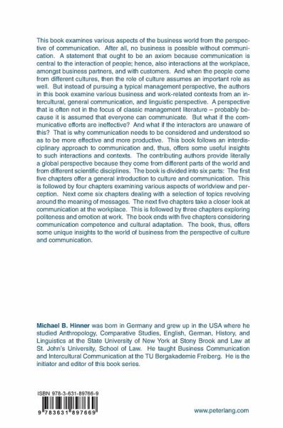 This book examines various aspects of the business world from the perspective of communication. After all, no business is possible without communication. A statement that ought to be an axiom because communication is central to the interaction of people; hence, also interactions at the workplace, amongst business partners, and with customers. And when the people come from different cultures, then the role of culture assumes an important role as well. But instead of pursuing a typical management perspective, the authors in this book examine various business and work-related contexts from an intercultural, general communication, and linguistic perspective. A perspective that is often not in the focus of classic management literature - probably because it is assumed that everyone can communicate. But what if the communicative efforts are ineffective? And what if the interactors are unaware of this? That is why communication needs to be considered and understood so as to be more effective and more productive. This book follows an interdisciplinary approach to communication and, thus, offers some useful insights to such interactions and contexts. The contributing authors provide literally a global perspective because they come from different parts of the world and from different scientific disciplines. The book is divided into six parts: The first five chapters offer a general introduction to culture and communication. This is followed by four chapters examining various aspects of worldview and perception. Next come six chapters dealing with a selection of topics revolving around the meaning of messages. The next five chapters take a closer look at communication at the workplace. This is followed by three chapters exploring politeness and emotion at work. The book ends with five chapters considering communication competence and cultural adaptation. The book, thus, offers some unique insights to the world of business from the perspective of culture and communication.
