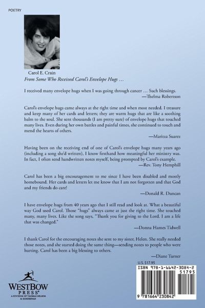 The inspirational book, No Clouds Tomorrow by Carol E. Crain, contains many of her songs, poems, and writings that will lift readers' spirits and encourage those suffering from depression and hurtful memories. She also writes about reaching out to others by sending Envelope Hugs by mail. In her poem "It's Hard to Celebrate Father's Day," she wrote, "It's hard to celebrate Father's Day / For a child who father is away / Unavailable and disconnected / Showing no love / To a child he's rejected." In "Return with me, Jesus," she wrote, "Return with me, Jesus, / To days that are past. / Walk down…mehr
