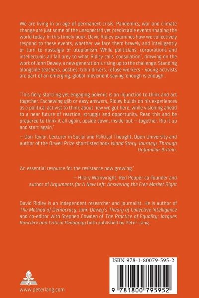 We are living in an age of permanent crisis. Pandemics, war and climate change are just some of the unexpected yet predictable events shaping the world today. In this timely book, David Ridley examines how we collectively respond to these events, whether we face them bravely and intelligently or turn to nostalgia or utopianism. While politicians, corporations and intellectuals all fall prey to what Ridley calls «consolation», drawing on the work of John Dewey, a new generation is rising up to the challenge. Standing alongside teachers, posties, train drivers, refuse workers - young activists are part of an emerging, global movement saying «enough is enough» «This fiery, startling yet engaging polemic is an injunction to think and act together. Eschewing glib or easy answers, Ridley builds on his experiences as a political activist to think about how we got here, while visioning ahead to a near future of reaction, struggle and opportunity. Read this and be prepared to think it all again, upside down, inside-out ¿ together. Rip it up and start again.» (Dan Taylor, Lecturer in Social and Political Thought, Open University and author of the Orwell Prize shortlisted book Island Story: Journeys Through Unfamiliar Britain) «An essential resource for the resistance now growing.» (Hilary Wainwright, Red Pepper co-founder and author of Arguments for A New Left: Answering the Free Market Right)