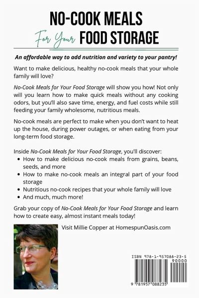 An affordable way to add nutrition and variety to your pantry! Want to make delicious, healthy no-cook meals that your whole family will love? No-Cook Meals for Your Food Storage will show you how! Not only will you learn how to make quick meals without any cooking odors, but you'll also save time, energy, and fuel costs while still feeding your family wholesome, nutritious meals. No-cook meals are perfect to make when you don't want to heat up the house, during power outages, or when eating from your long-term food storage. In 2009, Millie Copper transitioned her family to a whole, traditional, real food diet. Over the years, she has mastered the art of feeding her family an unprocessed, nutrient-dense, real food diet while simultaneously building up her food storage-without having to increase her meager food budget. And she is passionate about helping other families do the same! Inside No-Cook Meals for Your Food Storage, you'll discover:How to make delicious no-cook meals from grains, beans, seeds, and more How to make no-cook meals an integral part of your food storage Nutritious no-cook recipes that your whole family will love And much, much more! Grab your copy of No-Cook Meals for Your Food Storage and learn how to create easy, almost instant meals today!