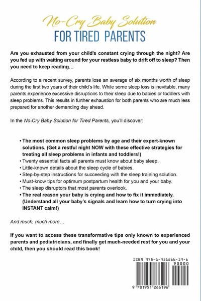 Are you exhausted from your child’s constant crying through the night? Are you fed up with waiting around for your restless baby to drift off to sleep? Then you need to keep reading… According to a recent survey, parents lose an average of six months worth of sleep during the first two years of their child’s life. While some sleep loss is inevitable, many parents experience excessive disruptions to their sleep due to babies or toddlers with sleep problems. This results in further exhaustion for both parents who are much less prepared for another demanding day ahead. In the No-Cry Baby Solution for Tired Parents, you’ll discover: The most common sleep problems by age and their expert-known solutions. (Get a restful night NOW with these effective strategies for treating all sleep problems in infants and toddlers!) Twenty essential facts all parents must know about baby sleep. Little-known details about the sleep cycle of babies. Step-by-step instructions for succeeding with the sleep training solution. Must-know tips for optimum postpartum health for you and your baby. The sleep disruptors that most parents overlook. The real reason your baby is crying and how to fix it immediately. (Understand all your baby’s signals and learn how to turn crying into INSTANT calm!) And much, much more… Even if your baby is a constant crier and every trick you’ve tried has failed, the extensive research behind this guide can ensure that you’ll come to a full understanding of your child’s sleep patterns and learn all the tricks for inducing smooth, undisturbed sleep, resulting in a much happier household. By relying on the expert research behind this guide, you’ll identify the exact reasons behind your child’s disrupted sleep patterns and the best solutions for bringing about an immediate improvement. If you want to access these transformative tips only known to experienced parents and pediatricians, and finally get much-needed rest for you and your child, then you should read this book!