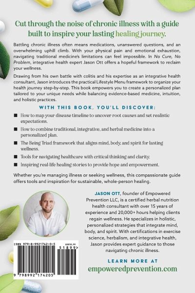 Cut through the noise of chronic illness with a guide built to inspire your lasting healing journey. Battling chronic illness can mean a lifetime of medications and unanswered questions. Between your constant pain, physical limitations, and the mental and emotional toll, navigating the restraints of traditional medicine can be an overwhelming uphill climb. In No Cure, No Problem, discover the life-changing framework that offers a hopeful path forward for chronic illness sufferers. Drawing from his personal battle with colitis and his professional expertise as an integrative health consultant, Jason Ott combines evidence-based insights with real-world stories to guide you toward meaningful healing. Introducing the practical Lifestyle Menu framework, No Cure, No Problem gives you the tools to organize your health journey step-by-step, focusing on bio-individuality-what works for you, not a one-size-fits-all solution. With real-life testimonials and clear, actionable advice, this book makes even complex healing techniques approachable and inspiring. Simplify the overwhelming maze of health options and gain actionable steps to regain your health, one choice at a time. Discover:How to map your personal disease timeline to uncover the root causes of illness and set expectations for healing. How integrative, herbal, and Western traditional medicine can work together to create a personalized, holistic plan with better results. Why aligning your mind, body, and spirit with the Being Triad framework is the key to lasting wellness and self-healing. The tools to think critically about healing and to balance evidence-based science with intuition so you can navigate the healthcare system from an informed perspective. Real-life healing testimonials that demonstrate what's possible even in seemingly dire situations, offering empowerment, hope, and inspiration. Whether you're struggling with chronic illness, caring for a loved one, or simply seeking holistic wellness, No Cure, No Problem offers a practical way to take control of your health by integrating diverse modalities into a personalized and sustainable plan. With compassion, heartfelt stories, and a wealth of tools, No Cure, No Problem is your guide to whole-person health and healing.