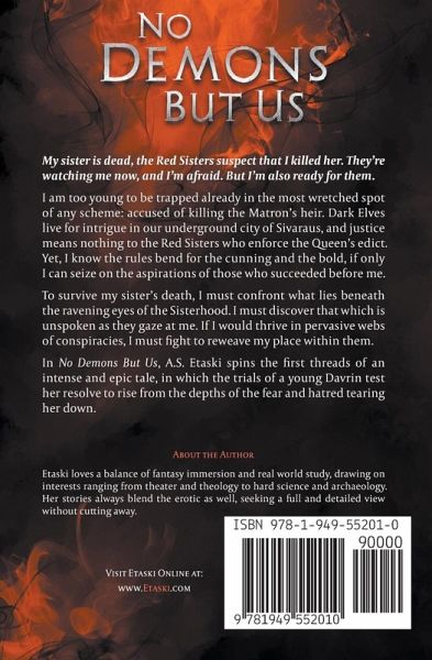 My sister deserved to die, but I didn't kill her. The infamous Sisterhood couldn't care less. It's the perfect excuse to make their move. My name is Sirana. I am a young Noble trapped in a most wretched spot: accused of assassinating my sister, the Matron's heir. If I take the blame, I am next on the sacrificial altar. Dark Elves live for intrigue in our underground matriarchy. We bend the rules for the cunning and the bold. To survive, I must play the game. Court intrigue, demonic rituals, and mind-rending trials against deadly foes surround me, pervasive webs spun by our sadistic priesthood and the Queen's brutal enforcers. Through it all, the Red Sisters delight in watching me. I must prove myself beneath their ravenous gazes, engage in the power play, or become the next meal for our goddess. A.S. Etaski spins the first threads of an intense and epic tale with No Demons But Us, in which the trials of a young Davrin test her resolve to rise from the depths of fear and hatred tearing her down. Sister Seekers is an adult epic fantasy with an ever-broadening scope. Found family is a core theme throughout, and fans of Dungeons & Dragons will find familiar grounds. This epic is perfect for fans of entwined plots, challenging themes, immersive worldbuilding, and elements of erotic horror. Sexuality and inner conflict play into character growth with nuance, intrigue, action, and magic. The series begins underground with an isolated race of Dark Elves whose intricate webs first ensnare then catapult us to places a Red Sister can only imagine in her dreams.
