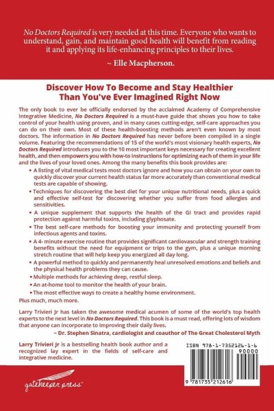 The only book to ever be officially endorsed by the acclaimed Academy of Comprehensive Integrative Medicine, No Doctors Required is a must-have guide for everyone wanting to take control of their health using proven, and in many cases cutting-edge, self-care approaches they can do on their own. Most of these health-boosting methods aren't even known by most doctors. The information in No Doctors Required has never before been compiled in a single volume. Drawing on the author's nearly 30 years of research as a noted lay health expert and the recommendations of 15 of the world's most visionary health experts, including Drs. C. Norman Shealy, Zach Bush, W, Lee Cowden, Stephen Sinatra, and Brad Nelson, No Doctors Required introduces readers to the 10 most essential keys necessary for creating excellent health, and then empowers them with how-to instructions for optimizing each of those keys in their own lives and the lives of their loved ones. Among the many benefits this book provides are: A listing of important medical tests readers can obtain on their own to quickly discover their current health status far more accurately than conventional medical tests are capable of showing. Techniques for discovering the best diet for their unique nutritional needs. A quick and effective self-test for discovering food allergies and sensitivities. A unique discovery that supports the health of the GI tract and provides rapid protection against harmful toxins, including glyphosate. A powerful 4- minute exercise routine that provides significant cardiovascular and strength training benefits without the need for equipment or trips to the gym. A powerful method to quickly and permanently heal unresolved emotions and beliefs and the physical health ailments they can cause. Multiple methods for achieving healthy sleep. Plus much more.