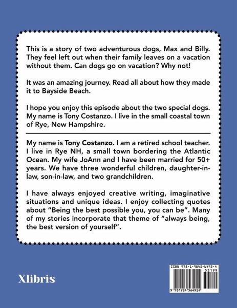 This is a story of two adventurous dogs, Max and Billy. They feel left out when their family leaves on a vacation without them. Can dogs go on vacation? Why not! It was an amazing journey. Read all about how they made it to Bayside Beach. I hope you enjoy this episode about the two special dogs. My name is Tony Costanzo. I live in the small coastal town of Rye, New Hampshire.