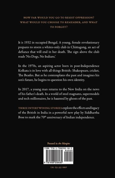 Three intertwining stories explore the effects and legacy of the British in India. It is 1932 in occupied Bengal. A young revolutionary prepares to storm a whites-only club in Chittagong, an act of defiance that will end in her taking her own life. The sign above the club reads No Dogs, No Indians. Decades later, an aspiring intellectual born in post-independence Kolkata is in love with all things British: Shakespeare, cricket, The Beatles. But as he contemplates the past and imagines his children's future, he begins to question his own identity. Now in 2017, a man returns from London on the news of his father's death. In the New India, he encounters steel magnates, supermodels and tech millionaires, but is haunted by ghosts from the past. Three intertwining stories explore the effects and legacy of the British in India in a powerful new play by poet and playwright Siddhartha Bose to mark the 70th anniversary of Indian independence.