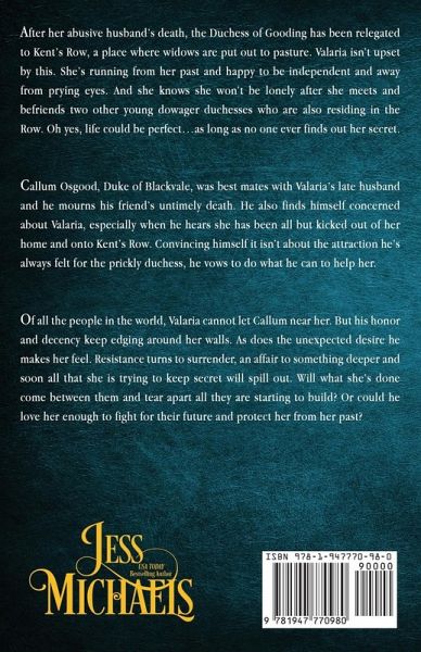 After her abusive husband's death, the Duchess of Gooding has been relegated to Kent's Row, a place where widows are put out to pasture. Valaria isn't upset by this. She's running from her past and happy to be independent and away from prying eyes. And she knows she won't be lonely after she meets and befriends two other young dowager duchesses who are also residing in the Row. Oh yes, life could be perfect...as long as no one ever finds out her secret. Callum Osgood, Duke of Blackvale, was best mates with Valaria's late husband and he mourns his friend's untimely death. He also finds himself concerned about Valaria, especially when he hears she has been all but kicked out of her home and onto Kent's Row. Convincing himself it isn't about the attraction he's always felt for the prickly duchess, he vows to do what he can to help her. Of all the people in the world, Valaria cannot let Callum near her. But his honor and decency keep edging around her walls. As does the unexpected desire he makes her feel. Resistance turns to surrender, an affair to something deeper and soon all that she is trying to keep secret will spill out. Will what she's done come between them and tear apart all they are starting to build? Or could he love her enough to fight for their future and protect her from her past? This is the first in The Kent's Row Duchesses Series and can be read as a standalone book.