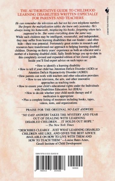 Parents and teachers of learning disabled children have tumed to Sally Smith's No Easy Answers for information, advice, and comfort for more than fifteen years. In this revised, trade paperback edition of the latest information on learning disabilities in a clear, honest, and accessible way. This completely updated edition contains new chapters on Attention Deficit Disorder and Attention Deficit Hyperactivity Disorder, and on the public laws that guarantee an equal education for learning disabled children. There is also an entirely new section on learning disabled adults and the laws that protect them. Sally Smith, the parent of a learning disabled child herself, guides parents along every step of the way, from determining if their child is learning disabled to challenging the school system to provide special services. Drawing on more than twenty-five years of experience at her own nationally acclaimed school, she also offers valuable strategies to teachers who are anxious or discouraged as they struggle with learning disabled students. Although there are no easy answers, Sally Smith's experience, wealth of information, and sense of humor provide essential support.