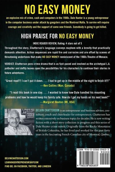 No Easy Money "You never win playing by the rules." Entrepreneurs face challenges every day from inside the business and from the world around them. It’s hard to be a hero. This is the story of an entrepreneur who wants to win and not play too far outside the rules. Dale Hunter is a young entrepreneur in Montreal running a successful business in the 1980s world of personal computers. He’s having fun and making money until the bad guys arrive. Now he has to try to survive without playing by gangster rules. It will require courage and creativity and the support of some new friends. While fighting off the criminals, he still has to manage challenges from his employees and customers, the bank and his partners and his two suppliers in Korea and Taiwan. He has to make deals with them all to stay alive. It starts with a demand for protection money and threats of violence to his family. Hunter agrees to make payments to a gangster named Jacques Talbot. But the pressure increases as Talbot squeezes him for more. Hunter decides to call the cops. That’s a mistake and the criminals raise their demands and the threats to his family. Hunter makes a deal with Frank the Fixer, a tough young Somalian refugee who now works on both sides of the law in Montreal. He can be more creative than the cops, but his first attempt to take out Talbot makes matters worse. Hunter tries to deal with the gangsters himself and only digs himself in deeper again. Frank and Hunter decide the solution is to raise the stakes with an introduction to the Montreal Mafia who will take care of the other gangsters. Hunter also appeals to his banker, his partners and his suppliers for help, but he is still not safe from the gangsters. He’s now caught between the first gang of thugs and the Mafia who are at war with them. Somebody is going to get killed. Dale Hunter may never get back to business as usual.