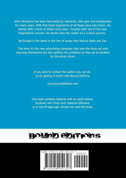 John Strickland has been fascinated by restraints, bike gear and straitjackets for many years. With first hand experience of all these (plus lots more), his stories offer a level of detail rarely seen. Coupled with one of the best imaginations around, his stories take the reader on a unique journey. No Escape is the latest in the line of books that feature Stefa and Zac. This time it's the new advertising campaign that sees the boys not only enjoying themselves but also getting into problems as they go on location for the photo shoot.