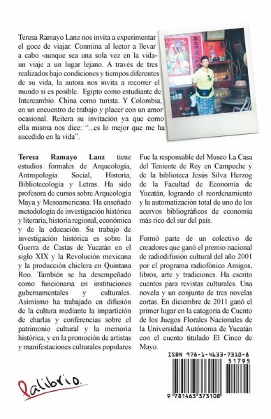 Teresa Ramayo Lanz nos invita a experimentar el goce de viajar. Conmina al lector a llevar a cabo -aunque sea una sola vez en la vida- un viaje a un lugar lejano. A través de tres realizados bajo condiciones y tiempos diferentes de su vida, la autora nos invita a recorrer el mundo si es posible. Egipto como estudiante de Intercambio. China como turista. Y Colombia, en un encuentro de trabajo y placer con un amor ocasional. Reitera su invitación ya que como ella misma nos dice: "...es lo mejor que me ha sucedido en la vida".