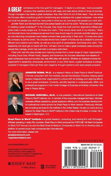 In this follow-up guide to The Great Workplace, experts from Great Place to Work(r) Institute, Inc. reveal the most common excuses managers use for why they can't create a great workplace. Authors Jennifer Robin and Michael Burchell poke holes in every single excuse. Whether the reasons involve the organization's leadership, employees, environment, or any other factor, the authors explain that if managers lead people properly, they can create a great workplace. The authors explore how managers can interrupt their own negative thought patterns and instead create lasting change, and they describe how great workplaces have surmounted very real difficulties with aplomb.