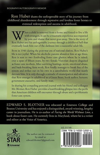 When a child is removed from a home and forced to live a life with strangers, it can be a traumatic experience accompanied by pain and shame that never goes away. This is the story of Ron Huber and his unforgettable journey through a childhood hell that eventually leads him out of the darkness into a successful adult life. Born in 1949 during the post-war era of national elation, Ron Huber's life is not joyful. When his alcoholic parents abandon him at age three, Ron is sent to two foreboding foster care ghettos where he is raised, over a span of fifteen years, by two female Victorian despots disguised as foster care mothers. After surviving beatings, scorn, emotional abuse, and back-breaking farm work, Ron finally manages to break free of the system and strikes out on his own in a cannibalistic world that nearly devours him. It is only through a miracle of emancipation and salvation that Ron emerges in adulthood as a Green Beret, book author, lecturer, government executive, and family man. In sharing his compelling personal journey, Ron Huber provides a heartbreaking glimpse into the perils that American children still encounter through abuse and a problematic foster care system.
