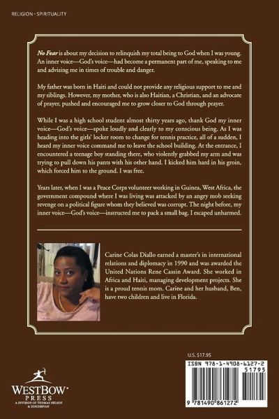 No Fear is about my decision to relinquish my total being to God when I was young. An inner voice—God’s voice—had become a permanent part of me, speaking to me and advising me in times of trouble and danger. My father was born in Haiti and could not provide any religious support to me and my siblings. However, my mother, who is also Haitian, a Christian, and an advocate of prayer, pushed and encouraged me to grow closer to God through prayer. While I was a high school student almost thirty years ago, thank God my inner voice—God’s voice—spoke loudly and clearly to my conscious being. As I was heading into the girls’ locker room to change for tennis practice, all of a sudden, I heard my inner voice command me to leave the school building. At the entrance, I encountered a teenage boy standing there, who violently grabbed my arm and was trying to pull down his pants with his other hand. I kicked him hard in his groin, which forced him to the ground. I was free. Years later, when I was a Peace Corps volunteer working in Guinea, West Africa, the government compound where I was living was attacked by an angry mob seeking revenge on a political figure whom they believed was corrupt. The night before, my inner voice—God’s voice—instructed me to pack a small bag. I escaped unharmed.
