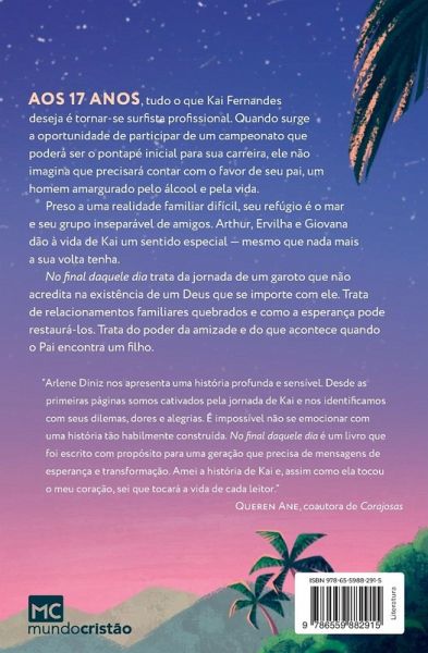 ## Da coautora de Corajosas ## Aos 17 anos, tudo o que Kai Fernandes deseja é tornar-se surfista profissional. Quando surge a oportunidade de participar de um campeonato que poderá ser o pontapé inicial para sua carreira, ele não imagina que precisará contar com o favor de seu pai, um homem amargurado pelo álcool e pela vida. Preso a uma realidade familiar difícil, seu refúgio é o mar e seu grupo inseparável de amigos. Arthur, Ervilha e Giovana dão à vida de Kai um sentido especial - mesmo que nada mais a sua volta tenha. No final daquele dia trata da jornada de um garoto que não acredita na existência de um Deus que se importe com ele. Trata de relacionamentos familiares quebrados e como a esperança pode restaurá-los. Trata do poder da amizade e do que acontece quando o Pai encontra um filho. "Arlene Diniz nos apresenta uma história profunda e sensível. Desde as primeiras páginas somos cativados pela jornada de Kai e nos identificamos com seus dilemas, dores e alegrias. É impossível não se emocionar com uma história tão habilmente construída. No final daquele dia é um livro que foi escrito com propósito para uma geração que precisa de mensagens de esperança e transformação. Amei a história de Kai e, assim como ela tocou o meu coração, sei que tocará a vida de cada leitor." Queren Ane, coautora de Corajosas