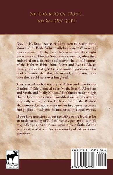 Daniel H. Ronis was curious to learn more about the stories of the Bible. What really happened? Who wrote these stories and why were they recorded? He sought out a channel, Donna Somerville, and together they embarked on a journey to discover the untold stories of the Hebrew Bible, from Adam and Eve to Moses through a series of Q&A type channeling sessions. This book contains what they discovered, and it was more than they could have ever imagined. They started with the story of Adam and Eve in the Garden of Eden, moved onto Noah, Joseph, Abraham and Sarah, and finally Moses. All of the stories, through channel, came to be more plausible than how there were originally written in the Bible and all of the Biblical characters asked about were real or in a few cases, were composites of real persons, and based on actual events. If you have questions about the Bible or are looking for an understanding of Biblical verses, perhaps this book may offer you insights and restore your faith. At the very least, read it with an open mind and ask your own questions.