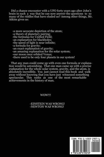Newton was wrong! Gravity is not a force of attraction. But knowing that is only the beginning to understanding our universe! Among other things in this book, Mr. Atkins gives us: -a more accurate depiction of the atom; -a theory of planetary pairing; -the formulas for Unified Field; -an explanation for blackholes; -the speed of light is near infinite; -a formula for gravity; -an exact explanation of gravity; -an amazing explanation for the solar system! Read the preview. It includes the formula for gravity and a little math. Then decide if John is a crackpot or someone worthy of listening to.