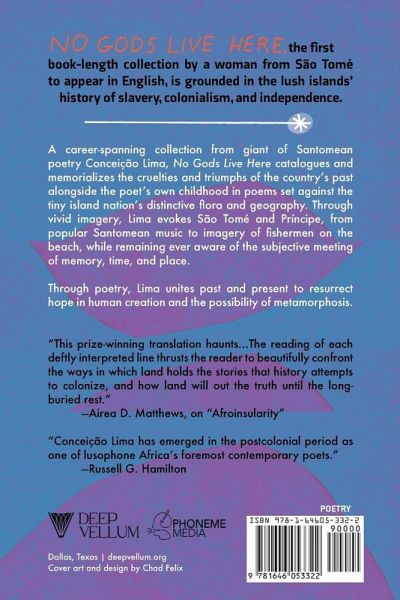 "One of the few book-length poetry collections from Säao Tomâe to appear in English, Lima's poetry is grounded in place and history of the region. A career-spanning collection from Sao Tomean master Conceicao Lima, No Gods Live Here summons the intricacies of her personal history of the landscape with the complicated lineage of the region. Lima houses the cruelties of the country's past alongside childhood memories, flora, and fauna. Through vivid imagery, Lima's deep evocations of Säao Tomâe extend from popular Santomean music to imagery of fishermen on the beach, while ever-aware of the subjective meeting of memory, time, and place. Through poetry, Lima brings past and present together to resurrect hope in human creation and the possibility of metamorphosis"--