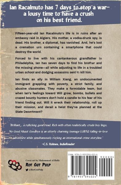 A 2022 IndieBRAG medallion recipient "Brilliant... a rollicking good read. No Good About Goodbye is an utterly charming teenage LGBTQ falling-in-love adventure." -C.S. Holmes, Indiereader Ian Racalmuto can handle assassins, bombs and bullets... but harboring a crush on his best friend? Stopping world war is easier. 15-year-old Ian Racalmuto's life is in ruins after an embassy raid in Algiers. His mother, a vodka-drunk spy, is dead. His brother, a diplomat, has vanished. And, he's lost a cremation urn containing a smartphone that could destroy the world. Forced to live with his cantankerous grandfather in Philadelphia, Ian has seven days to find his brother and secure the phone-all while adjusting to life in a troubled urban school and dodging assassins sent to kill him. Ian finds an ally in William Xiang, an undocumented immigrant grappling with poverty, a strict family, and abusive classmates. They make a formidable team, but when Ian's feelings toward Will grow, bombs, bullets and crazed bounty hunters don't hold a candle to his fear of his friend finding out. Will it wreck their relationship, roll up their mission, and derail a heist they've planned at the State Department? Like a dime store pulp adventure of the past, No Good About Goodbye is an incautious, funny, coming-of-age tale for mature teens and adult readers. Rot Gut Pulp: Entertainment, not Genius.¿