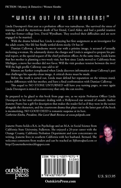 NO GOOD DEED By Jeanette A. Fratto When Hollywood clashes with conservative Orange County, California, probation officer Linda Davenport finds herself in the middle of the uproar. "Anyone but me!" she declares, upon learning that handsome, squeaky clean, movie star, Damian Calloway, has been arrested for sexual molestation, and the court wants probation to prepare a pre-trial report. But the chief probation officer wants no one but Linda to handle the case, and personally assigns it to her. Linda's tumultuous first year as a probation officer is behind her, and she is comfortable in her assignment as an adult court investigator. She's engaged to her college love, David Wyndham, and is certain her life has settled down nicely. Now this! The media is in a frenzy over Calloway's arrest, and everyone involved with the case is a target for their scrutiny. Linda is warned to keep a low profile as she sorts out why Calloway was outside a country bar late at night in San Juan Capistrano, far from his home in Los Angeles. He adamantly denies any wrongdoing, and demands a speedy trial. Is it true that "no good deed" goes unpunished? Or is it a "good deed?" In the meantime, Linda learns that her mother is coming for a two-week visit, her first since Linda left Michigan for California. She was never in favor of the move, and will now have two weeks to express her opinions and create further tension in Linda's life. When Linda tries to satisfy her mother's curiosity about movie stars, her efforts backfire, and the newspapers have a field day making Linda look biased. Her life is further complicated when information she learns about Calloway challenges his "perfect" reputation. But does it make him a molester? A critical decision must be made. Before the truth comes out, Linda must defend her reputation on the witness stand, resolve conflicts with her mother, and have a final confrontation with Damian Calloway. This sequel to NO STONE UNTURNED puts Linda, once again, in the center of controversy; one which only she can resolve. As Catherine Kitcho, President of Pele Publications, said in her review, "Be prepared to be glued to this book from page one..."