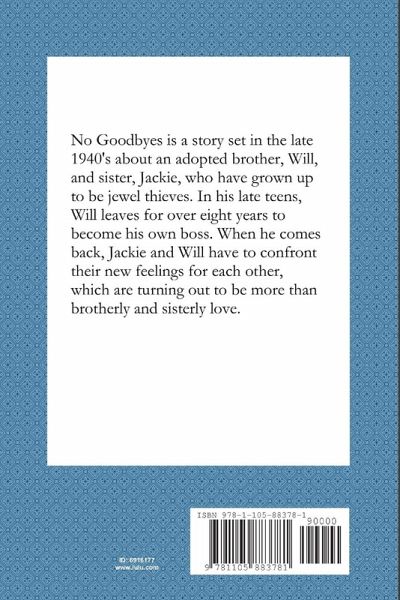No Goodbyes is a story set in the late 1940's about an adopted brother, Will, and sister, Jackie, who have grown up to be jewel thieves. In his late teens, Will leaves for over eight years to become his own boss. When he comes back, Jackie and Will have to confront their new feelings for each other, which are turning out to be more than brotherly and sisterly love.