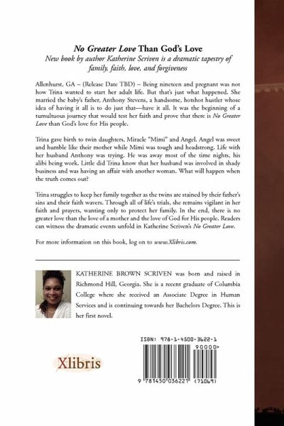 No Greater Love Than God's Love New book by author Katherine Scriven is a dramatic tapestry of family, faith, love, and forgiveness Allenhurst, GA - (Release Date TBD) - Being nineteen and pregnant was not how Trina wanted to start her adult life. But that's just what happened. She married the baby's father, Anthony Stevens, a handsome, hotshot hustler whose idea of having it all is to do just that-have it all. It was the beginning of a tumultuous journey that would test her faith and prove that there is No Greater Love than God's love for His people. Trina gave birth to twin daughters, Miracle "Mimi" and Angel. Angel was sweet and humble like their mother while Mimi was tough and headstrong. Life with her husband Anthony was trying. He was away most of the time nights, his alibi being work. Little did Trina know that her husband was involved in shady business and was having an affair with another woman. What will happen when the truth comes out? Trina struggles to keep her family together as the twins are stained by their father's sins and their faith wavers. Through all of life's trials, she remains vigilant in her faith and prayers, wanting only to protect her family. In the end, there is no greater love than the love of a mother and the love of God for His people. Readers can witness the dramatic events unfold in Katherine Scriven's No Greater Love. For more information on this book, log on to www.Xlibris.com.