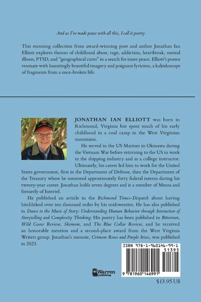 This stunning collection from award-winning poet and author Jonathan Ian Elliott explores themes of childhood abuse, rage, addiction, heartbreak, mental illness, PTSD, and "geographical cures" in a search for inner peace. Elliott's poems resonate with hauntingly beautiful imagery and poignant lyricism, a kaleidoscope of fragments from a once-broken life.