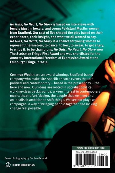 We are sick of it, being ignored We are sick of it, being indoors No Guts, No Heart, No Glory explores being young, fearless and doing the unexpected. Working closely with five 16-22-year-old Muslim women and former National Champion boxer Ambreen Sadiq. This play represents a young Muslim female experience of life in the UK. It speaks to young people and will make them feel braver and encourage them to live how they want to live, so that they are free and confident to make their own choices tomorrow. 'Common Wealth are an award-winning, Bradford-based company who make site-specific theatre events that are political and contemporary - based in the present day - the here and now. Our ideas are rooted in socialist politics, working class backgrounds, a keen interest in contemporary music/theatre/art/design, the people that we meet and an idealistic ambition to shift things. We see our plays as campaigns, a way of bringing people together and making change feel possible. Aisha Zia is a playwright based in the UK. She completed her MA in Creative Writing (plays and screenplays) at City University, London. No Guts, No Heart, No Glory is her fourth full-length play. Aisha worked with Common Wealth on her adaptation An Indecent Incident from A Nasty Story by Fyodor Dostoevsky and wrote text for Our Glass House, a play which explored domestic abuse and toured disused houses around the UK from 2012- 2013. No Guts, No Heart, No Glory was winner of the Scotsman Fringe First Award at the Edinburgh Fringe, 2014 and was shortlisted for Amnesty International's Freedom of Expression Award in the same year'.