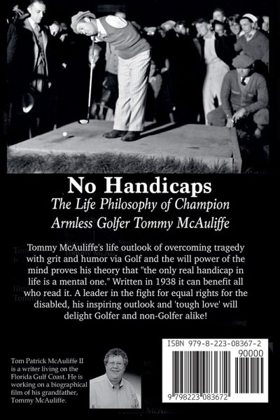 Here is the uplifting true-life philosophy from a book first written in 1938 and edited by his grandson Tom Patrick McAuliffe II. One of the original positive-thinking proponents his "No Handicaps" approach has touched thousands of people via articles, appearances and broadcasts. Among his many accomplishments, he: •Played with Golf Legends Jones, Hagan and Palmer •Played Golf in 49 states, Australia, Canada in one year. •Tommy McAuliffe also promoted rehabilitation laws and testified before Congress. •He was a Public Speaker, Reporter, Writer, Magazine Publisher, Father and Grandfather. Tommy McAuliffe's life outlook of overcoming tragedy with grit and humor via Golf and the will power of the mind proves his theory that "the only real handicap in life is a mental one." It can benefit all who read it. A leader in the fight for equal rights for the disabled, his inspiring outlook and 'tough love' will delight Golfer and non-Golfer alike!