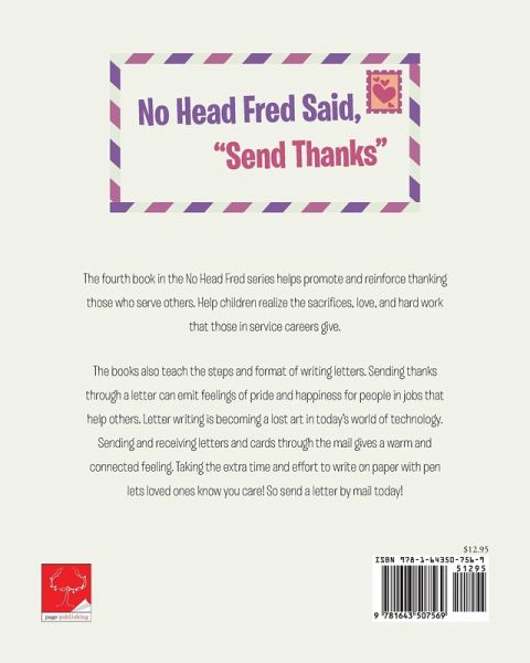 No Head Fred Says to Send Thanks. The fourth book in the No-Head Fred series helps promote and reinforce thanking those who serve others. Help children realize the sacrifices, love, and hard work that those in service careers give. The books also teach the steps and format of writing letters. Sending thanks through a letter can emit feelings of pride and happiness for people in jobs that help others. Letter writing is becoming a lost art in today's world of technology. Sending and receiving letters and cards through the mail gives a warm and connected feeling. Taking the extra time and effort to write on paper with pen lets loved ones know you care! So send a letter by mail today!